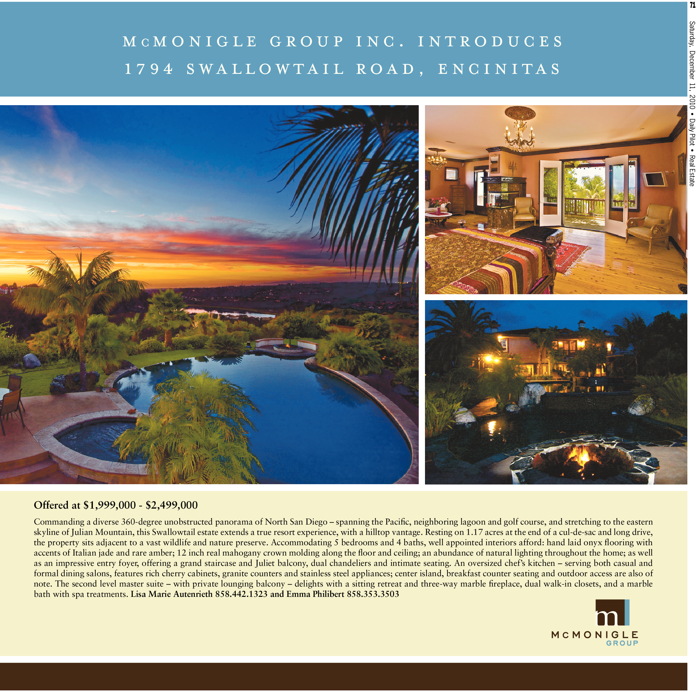 Offered at $1,999,000 - $2,499,000 M c M O N I G L E G R O U P I N C . I N T R O D U C E S 1 7 9 4 S W A L L O W T A I L R O A D , E N C I N I T A S Commanding a diverse 360-degree unobstructed panorama of North San Diego – spanning the Pacific, neighboring lagoon and golf course, and stretching to the eastern skyline of Julian Mountain, this Swallowtail estate extends a true resort experience, with a hilltop vantage. Resting on 1.17 acres at the end of a cul-de-sac and long drive, the property sits adjacent to a vast wildlife and nature preserve. Accommodating 5 bedrooms and 4 baths, well appointed interiors afford: hand laid onyx flooring with accents of Italian jade and rare amber; 12 inch real mahogany crown molding along the floor and ceiling; an abundance of natural lighting throughout the home; as well as an impressive entry foyer, offering a grand staircase and Juliet balcony, dual chandeliers and intimate seating. An oversized chef’s kitchen – serving both casual and formal dining salons, features rich cherry cabinets, granite counters and stainless steel appliances; center island, breakfast counter seating and outdoor access are also of note. The second level master suite – with private lounging balcony – delights with a sitting retreat and three-way marble fireplace, dual walk-in closets, and a marble bath with spa treatments. Lisa Marie Autenrieth 858.442.1323 and Emma Philibert 858.353.3503 71