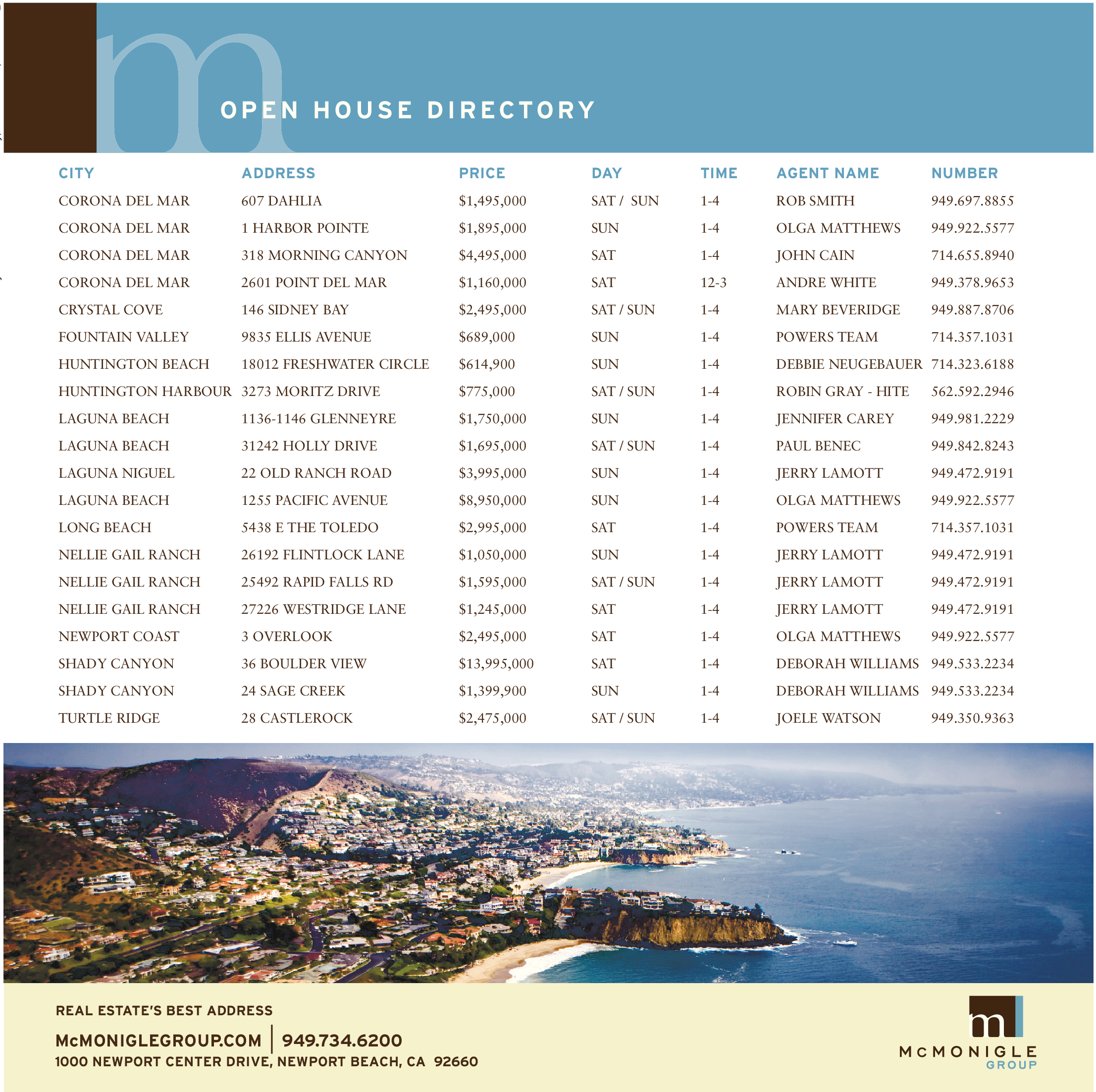 70 CITY CORONA DEL MAR CORONA DEL MAR CORONA DEL MAR CORONA DEL MAR CRYSTAL COVE FOUNTAIN VALLEY HUNTINGTON BEACH HUNTINGTON HARBOUR LAGUNA BEACH LAGUNA BEACH LAGUNA NIGUEL LAGUNA BEACH LONG BEACH NELLIE GAIL RANCH NELLIE GAIL RANCH NELLIE GAIL RANCH NEWPORT COAST SHADY CANYON SHADY CANYON TURTLE RIDGE REAL ESTATE’S BEST ADDRESS O P E N H O U S E D I R EC TO RY ADDRESS 607 DAHLIA 1 HARBOR POINTE 318 MORNING CANYON 2601 POINT DEL MAR 146 SIDNEY BAY 9835 ELLIS AVENUE 18012 FRESHWATER CIRCLE 3273 MORITZ DRIVE 1136-1146 GLENNEYRE 31242 HOLLY DRIVE 22 OLD RANCH ROAD 1255 PACIFIC AVENUE 5438 E THE TOLEDO 26192 FLINTLOCK LANE 25492 RAPID FALLS RD 27226 WESTRIDGE LANE 3 OVERLOOK 36 BOULDER VIEW 24 SAGE CREEK 28 CASTLEROCK McMONIGLEGROUP.COM 949.734.6200 1000 NEWPORT CENTER DRIVE, NEWPORT BEACH, CA 92660 PRICE $1,495,000 $1,895,000 $4,495,000 $1,160,000 $2,495,000 $689,000 $614,900 $775,000 $1,750,000 $1,695,000 $3,995,000 $8,950,000 $2,995,000 $1,050,000 $1,595,000 $1,245,000 $2,495,000 $13,995,000 $1,399,900 $2,475,000 DAY TIME SAT / SUN 1-4 SUN 1-4 SAT 1-4 SAT 12-3 SAT / SUN 1-4 SUN 1-4 SUN 1-4 SAT / SUN 1-4 SUN 1-4 SAT / SUN 1-4 SUN 1-4 SUN 1-4 SAT 1-4 SUN 1-4 SAT / SUN 1-4 SAT 1-4 SAT 1-4 SAT 1-4 SUN 1-4 SAT / SUN 1-4 AGENT NAME ROB SMITH OLGA MATTHEWS JOHN CAIN ANDRE WHITE MARY BEVERIDGE POWERS TEAM DEBBIE NEUGEBAUER ROBIN GRAY - HITE JENNIFER CAREY PAUL BENEC JERRY LAMOTT OLGA MATTHEWS POWERS TEAM JERRY LAMOTT JERRY LAMOTT JERRY LAMOTT OLGA MATTHEWS DEBORAH WILLIAMS DEBORAH WILLIAMS JOELE WATSON NUMBER 949.697.8855 949.922.5577 714.655.8940 949.378.9653 949.887.8706 714.357.1031 714.323.6188 562.592.2946 949.981.2229 949.842.8243 949.472.9191 949.922.5577 714.357.1031 949.472.9191 949.472.9191 949.472.9191 949.922.5577 949.533.2234 949.533.2234 949.350.9363