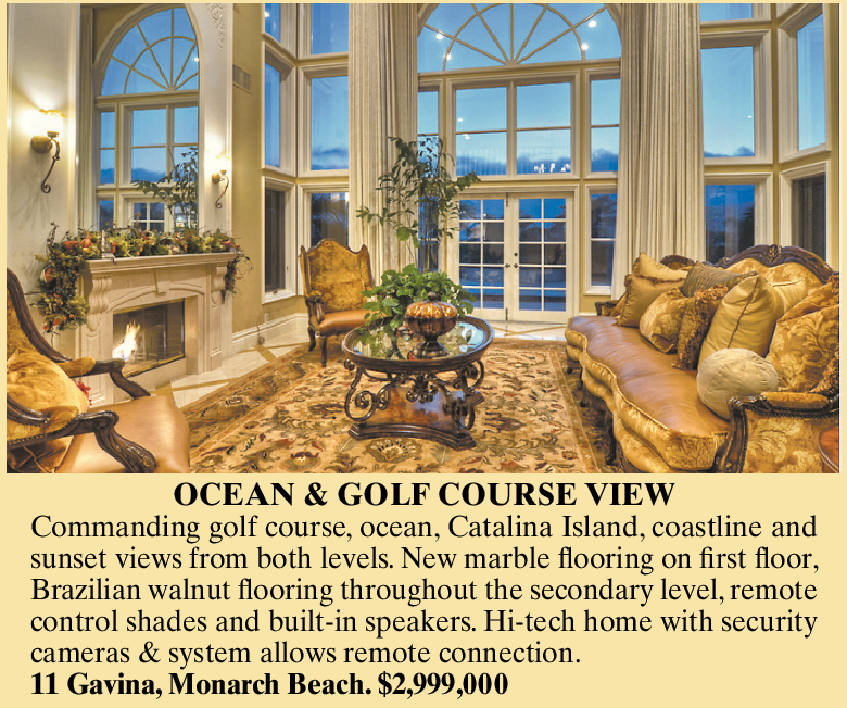 OCEAN & GOLF COURSE VIEW Commanding golf course, ocean, Catalina Island, coastline and sunset views from both levels. New marble flooring on first floor, Brazilian walnut flooring throughout the secondary level, remote control shades and built-in speakers. Hi-tech home with security cameras & system allows remote connection. 11 Gavina, Monarch Beach. $2,999,000