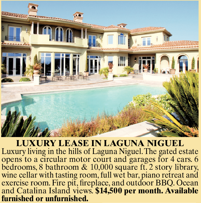 LUXURY LEASE IN LAGUNA NIGUEL Luxury living in the hills of Laguna Niguel.The gated estate opens to a circular motor court and garages for 4 cars. 6 bedrooms, 8 bathroom & 10,000 square ft. 2 story library, wine cellar with tasting room, full wet bar, piano retreat and exercise room. Fire pit, fireplace, and outdoor BBQ. Ocean and Catalina Island views. $14,500 per month. Available furnished or unfurnished.