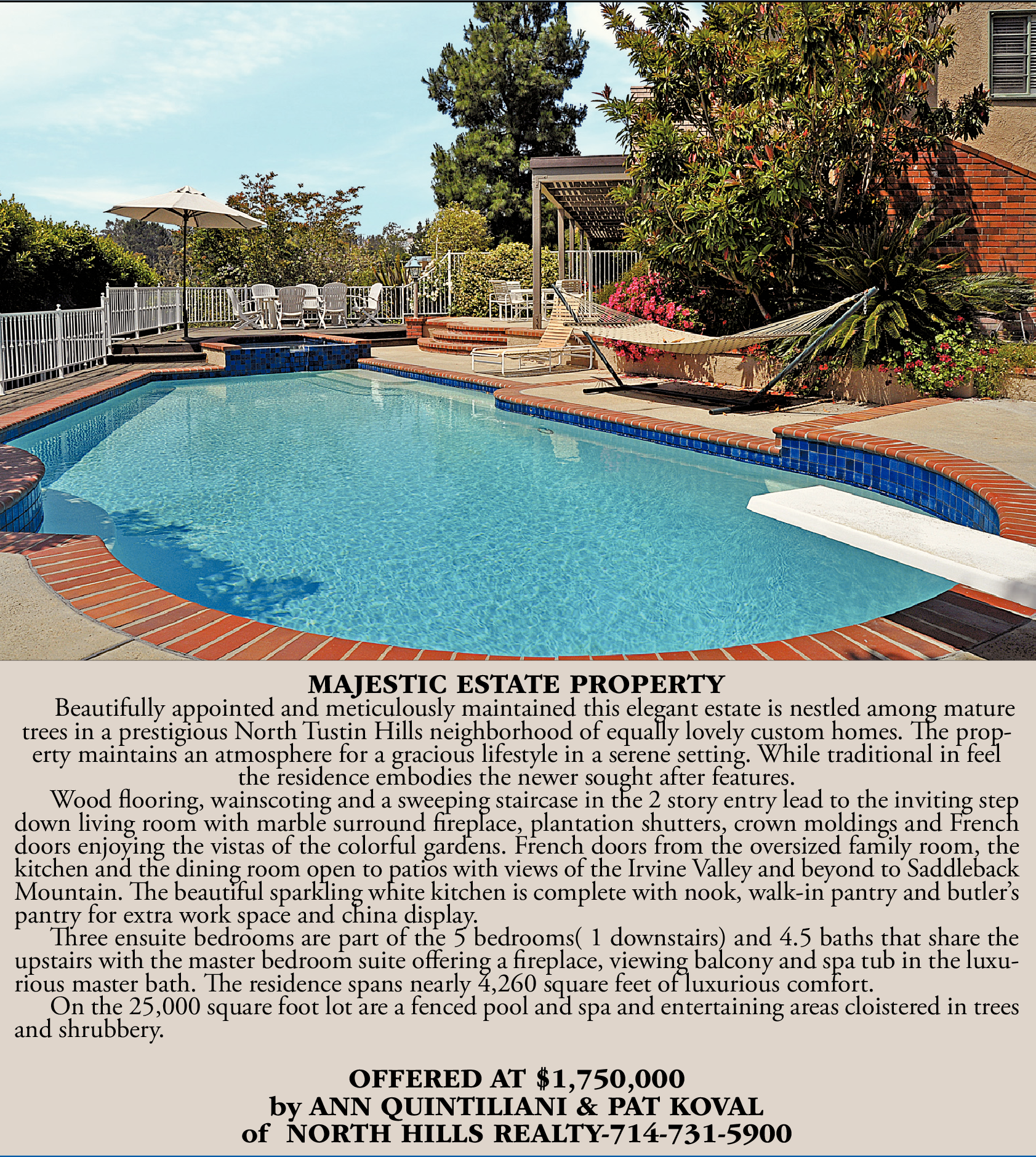 MAJESTIC ESTATE PROPERTY Beautifully appointed and meticulously maintained this elegant estate is nestled among mature trees in a prestigious North Tustin Hills neighborhood of equally lovely custom homes. The property maintains an atmosphere for a gracious lifestyle in a serene setting. While traditional in feel the residence embodies the newer sought after features. Wood flooring, wainscoting and a sweeping staircase in the 2 story entry lead to the inviting step down living room with marble surround fireplace, plantation shutters, crown moldings and French doors enjoying the vistas of the colorful gardens. French doors from the oversized family room, the kitchen and the dining room open to patios with views of the Irvine Valley and beyond to Saddleback Mountain. The beautiful sparkling white kitchen is complete with nook, walk-in pantry and butler’s pantry for extra work space and china display. Three ensuite bedrooms are part of the 5 bedrooms( 1 downstairs) and 4.5 baths that share the upstairs with the master bedroom suite offering a fireplace, viewing balcony and spa tub in the luxurious master bath. The residence spans nearly 4,260 square feet of luxurious comfort. On the 25,000 square foot lot are a fenced pool and spa and entertaining areas cloistered in trees and shrubbery. OFFERED AT $1,750,000 by ANN QUINTILIANI & PAT KOVAL of NORTH HILLS REALTY-714-731-5900