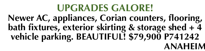 Newer AC, appliances, Corian counters, flooring, bath fixtures, exterior skirting & storage shed + 4 vehicle parking. BEAUTIFUL! $79,900 P741242 ANAHEIM