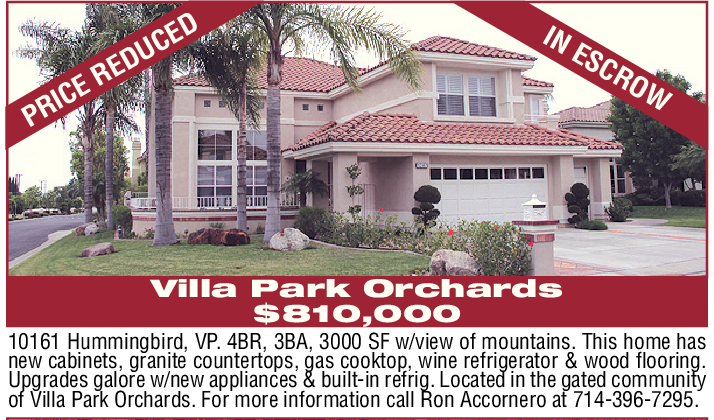 Villa Park Orchards $810,000 10161 Hummingbird, VP. 4BR, 3BA, 3000 SF w/view of mountains. This home has new cabinets, granite countertops, gas cooktop, wine refrigerator & wood flooring. Upgrades galore w/new appliances & built-in refrig. Located in the gated community of Villa Park Orchards. For more information call Ron Accornero at 714-396-7295.