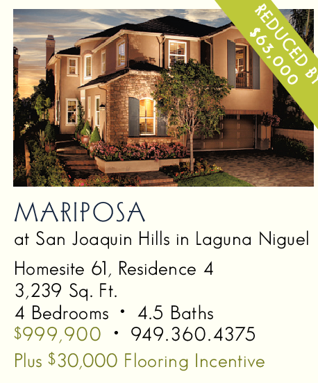 at San Joaquin Hills in Laguna Niguel Homesite 61, Residence 4 3,239 Sq. Ft. 4 Bedrooms • 4.5 Baths $999,900 • 949.360.4375 Plus $30,000 Flooring Incentive