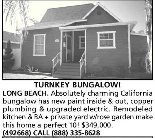 LONG BEACH. Absolutely charming California bungalow has new paint inside & out, copper plumbing & upgraded electric. Remodeled kitchen & BA + private yard w/rose garden make this home a perfect 10! $349,000. (492668) CALL (888) 335-8628
