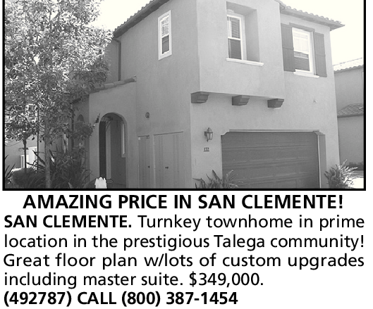 SAN CLEMENTE. Turnkey townhome in prime location in the prestigious Talega community! Great floor plan w/lots of custom upgrades including master suite. $349,000. (492787) CALL (800) 387-1454