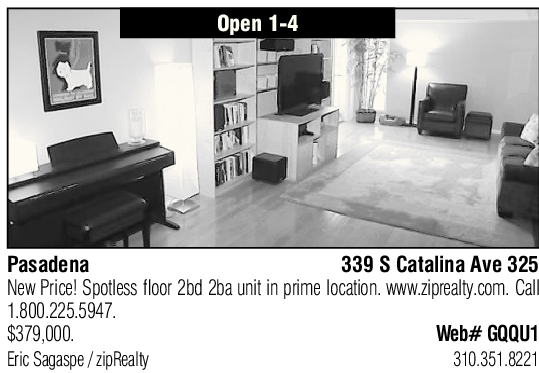 Pasadena 339 S Catalina Ave 325 1.800.225.5947. New Price! Spotless floor 2bd 2ba unit in prime location. www.ziprealty.com. Call $379,000. Web# GQQU1 Eric Sagaspe / zipRealty 310.351.8221