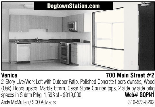 DogtownStation.com Venice 700 Main Street #2 2-Story Live/Work Loft with Outdoor Patio. Polished Concrete floors dwnstrs, Wood (Oak) Floors upstrs, Marble bthrm, Cesar Stone Counter tops, 2 side by side prkg spaces in Subtrn Prkg. 1,593 sf - $919,000. Web# GQPN1 Andy McMullen / SCO Advisors 310-573-8292