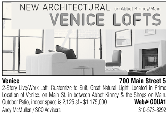 Venice 700 Main Street 5 2-Story Live/Work Loft, Customize to Suit, Great Natural Light. Located in Prime Location of Venice, on Main St. in between Abbot Kinney & the Shops on Main. Outdoor Patio, indoor space is 2,125 sf - $1,175,000 Web# GOUA1 Andy McMullen / SCO Advisors 310-573-8292