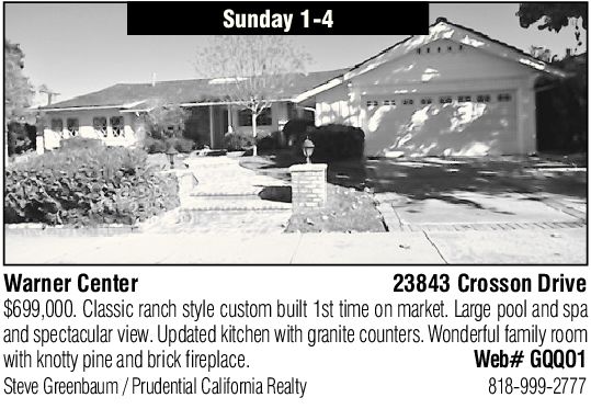Warner Center 23843 Crosson Drive $699,000. Classic ranch style custom built 1st time on market. Large pool and spa and spectacular view. Updated kitchen with granite counters. Wonderful family room with knotty pine and brick fireplace. Web# GQQO1 Steve Greenbaum / Prudential California Realty 818-999-2777