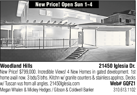 New Price! Open Sun 1-4 Woodland Hills 21450 Iglesia Dr. New Price! $799,000. Incredible Views! 4 New Homes in gated development. 1st home avail now. 3 bds/3 bths. Kitchn w/ granite counters & stainless applncs. Decks w/ Tuscan vus from all angles. 21450Iglesia.com Web# GQFZ1 Megan Whalen & Mickey Hedges / Gibson & Coldwell Banker 310.613.1102