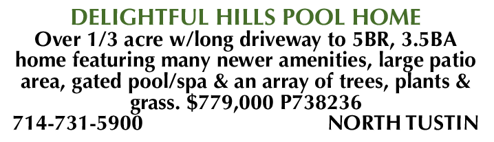 DELIGHTFUL HILLS POOL HOME Over 1/3 acre w/long driveway to 5BR, 3.5BA home featuring many newer amenities, large patio area, gated pool/spa & an array of trees, plants & grass. $779,000 P738236 714-731-5900 NORTH TUSTIN