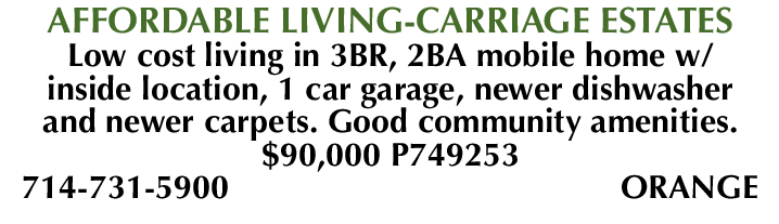 AFFORDABLE LIVING-CARRIAGE ESTATES Low cost living in 3BR, 2BA mobile home w/ inside location, 1 car garage, newer dishwasher and newer carpets. Good community amenities.