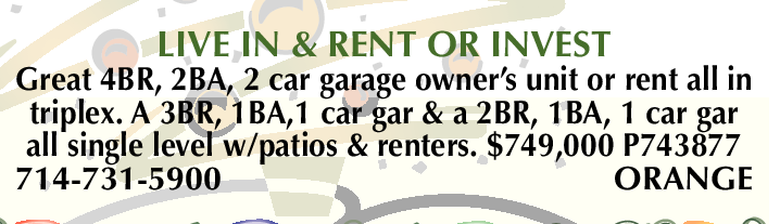 LIVE IN & RENT OR INVEST Great 4BR, 2BA, 2 car garage owner’s unit or rent all in triplex. A 3BR, 1BA,1 car gar & a 2BR, 1BA, 1 car gar all single level w/patios & renters. $749,000 P743877 714-731-5900 ORANGE