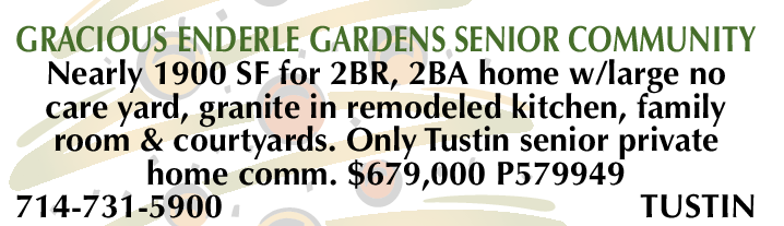 GRACIOUS ENDERLE GARDENS SENIOR COMMUNITY Nearly 1900 SF for 2BR, 2BA home w/large no care yard, granite in remodeled kitchen, family room & courtyards. Only Tustin senior private home comm. $679,000 P579949 714-731-5900 TUSTIN