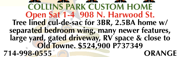 Tree lined cul-de-sac for 3BR, 2.5BA home w/ separated bedroom wing, many newer features, large yard, gated driveway, RV space & close to Old Towne. $524,900 P737349 714-998-0555 ORANGE