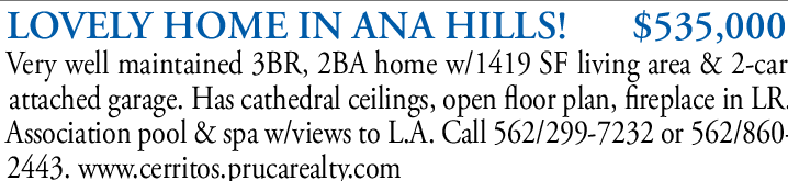 LOVELY HOME IN ANA HILLS! $535,000 Very well maintained 3BR, 2BA home w/1419 SF living area & 2-car attached garage. Has cathedral ceilings, open floor plan, fireplace in LR. Association pool & spa w/views to L.A. Call 562/299-7232 or 562/860- 2443. www.cerritos.prucarealty.com