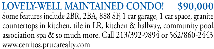 LOVELY-WELL MAINTAINED CONDO! $90,000 Some features include 2BR, 2BA, 888 SF, 1 car garage, 1 car space, granite countertops in kitchen, tile in LR, kitchen & hallway, community pool, association spa & so much more. Call 213/392-9894 or 562/860-2443. www.cerritos.prucarealty.com