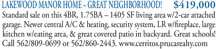 Call 562/809-0699 or 562/860-2443. www.cerritos.prucarealty.com