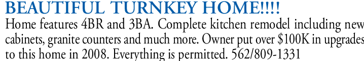 BEAUTIFUL TURNKEY HOME!!!! Home features 4BR and 3BA. Complete kitchen remodel including new cabinets, granite counters and much more. Owner put over $100K in upgrades to this home in 2008. Everything is permitted. 562/809-1331
