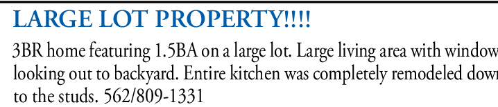 LARGE LOT PROPERTY!!!! 3BR home featuring 1.5BA on a large lot. Large living area with windows looking out to backyard. Entire kitchen was completely remodeled down to the studs. 562/809-1331