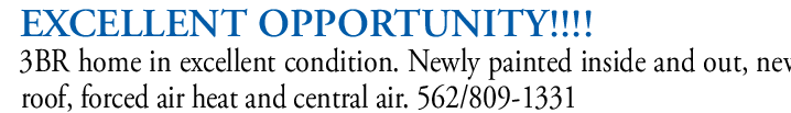 EXCELLENT OPPORTUNITY!!!! 3BR home in excellent condition. Newly painted inside and out, new roof, forced air heat and central air. 562/809-1331