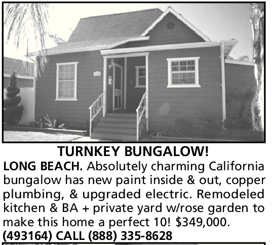 LONG BEACH. Absolutely charming California bungalow has new paint inside & out, copper plumbing, & upgraded electric. Remodeled kitchen & BA + private yard w/rose garden to make this home a perfect 10! $349,000.