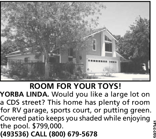 YORBA LINDA. Would you like a large lot on a CDS street? This home has plenty of room for RV garage, sports court, or putting green. Covered patio keeps you shaded while enjoying the pool. $799,000. (493536) CALL (800) 679-5678