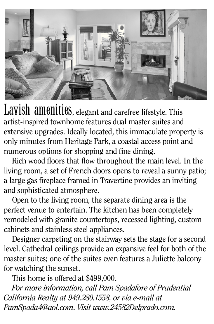 Lavish amenities, elegant and carefree lifestyle. This artist-inspired townhome features dual master suites and extensive upgrades. Ideally located, this immaculate property is only minutes from Heritage Park, a coastal access point and numerous options for shopping and fine dining. Rich wood floors that flow throughout the main level. In the living room, a set of French doors opens to reveal a sunny patio; a large gas fireplace framed in Travertine provides an inviting and sophisticated atmosphere. Open to the living room, the separate dining area is the perfect venue to entertain. The kitchen has been completely remodeled with granite countertops, recessed lighting, custom cabinets and stainless steel appliances. Designer carpeting on the stairway sets the stage for a second level. Cathedral ceilings provide an expansive feel for both of the master suites; one of the suites even features a Juliette balcony for watching the sunset. This home is offered at $499,000. For more information, call Pam Spadafore of Prudential California Realty at 949.280.1558, or via e-mail at PamSpada4@aol.com. Visit www.24582Delprado.com.