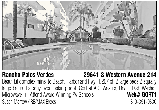 Rancho Palos Verdes 29641 S Western Avenue 214 Beautiful complex mins. to Beach, Harbor and Fwy. 1,207 sf 2 large beds 2 equally large baths. Balcony over looking pool. Central AC, Washer, Dryer, Dish Washer, Microwave + Attend Award Winning PV Schools Web# GQRT1 Susan Morrow / RE/MAX Execs 310-351-9830