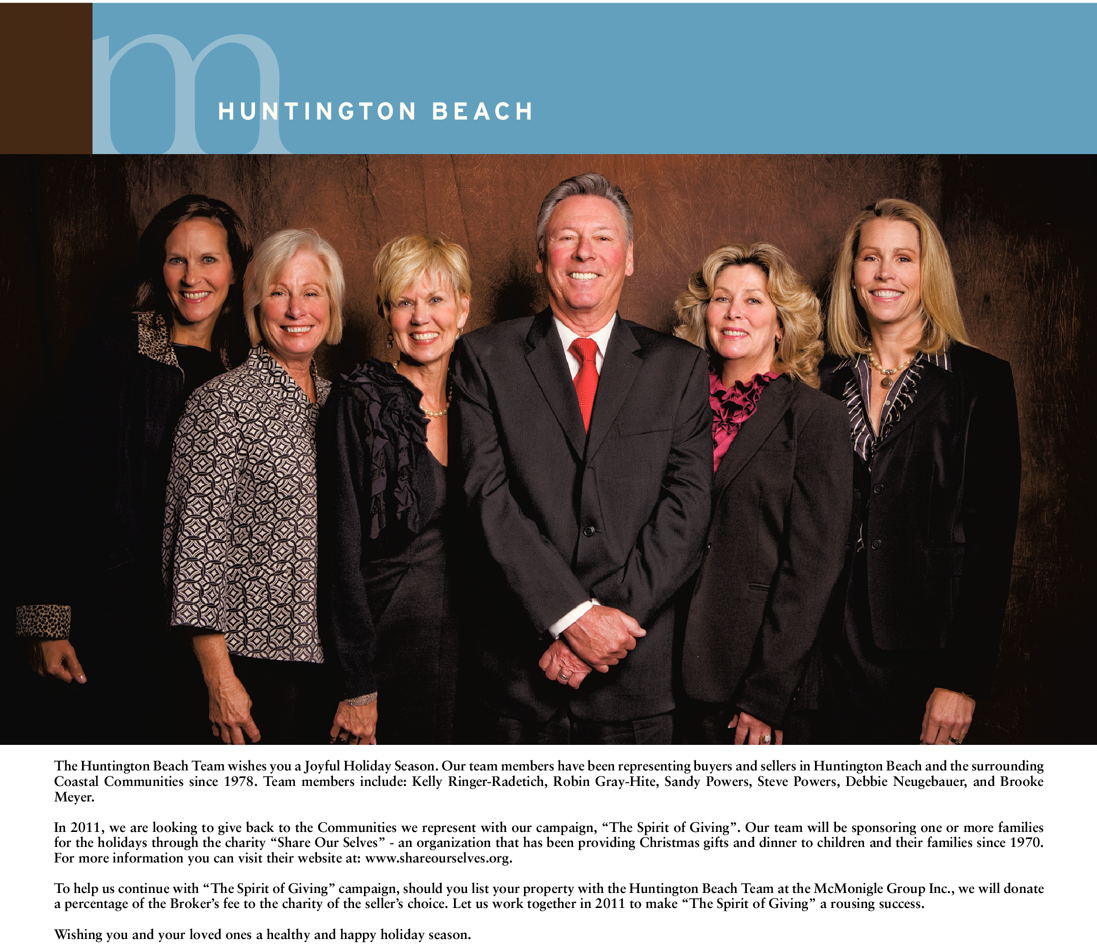 H U N T I N G T O N B E A C H The Huntington Beach Team wishes you a Joyful Holiday Season. Our team members have been representing buyers and sellers in Huntington Beach and the surrounding Coastal Communities since 1978. Team members include: Kelly Ringer-Radetich, Robin Gray-Hite, Sandy Powers, Steve Powers, Debbie Neugebauer, and Brooke Meyer. In 2011, we are looking to give back to the Communities we represent with our campaign, “The Spirit of Giving”. Our team will be sponsoring one or more families for the holidays through the charity “Share Our Selves” - an organization that has been providing Christmas gifts and dinner to children and their families since 1970. For more information you can visit their website at: www.shareourselves.org. To help us continue with “The Spirit of Giving” campaign, should you list your property with the Huntington Beach Team at the McMonigle Group Inc., we will donate a percentage of the Broker’s fee to the charity of the seller’s choice. Let us work together in 2011 to make “The Spirit of Giving” a rousing success. Wishing you and your loved ones a healthy and happy holiday season.