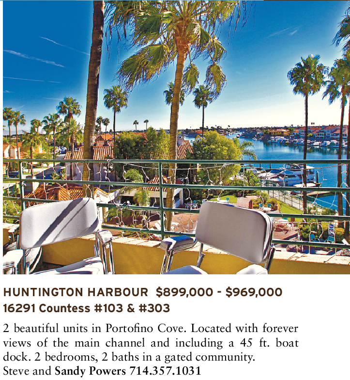 HUNTINGTON HARBOUR $899,000 - $969,000 16291 Countess #103 & #303 2 beautiful units in Portofino Cove. Located with forever views of the main channel and including a 45 ft. boat dock. 2 bedrooms, 2 baths in a gated community. Steve and Sandy Powers 714.357.1031