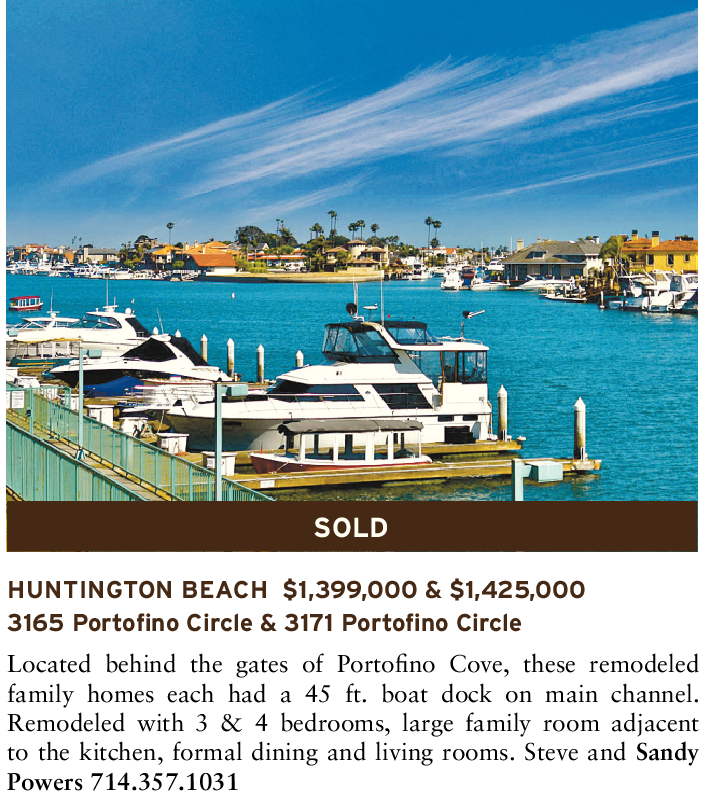 HUNTINGTON BEACH $1,399,000 & $1,425,000 3165 Portofino Circle & 3171 Portofino Circle Located behind the gates of Portofino Cove, these remodeled family homes each had a 45 ft. boat dock on main channel. Remodeled with 3 & 4 bedrooms, large family room adjacent to the kitchen, formal dining and living rooms. Steve and Sandy Powers 714.357.1031