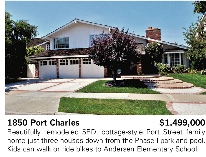 1850 Port Charles $1,499,000 Beautifully remodeled 5BD, cottage-style Port Street family home just three houses down from the Phase I park and pool. Kids can walk or ride bikes to Andersen Elementary School.