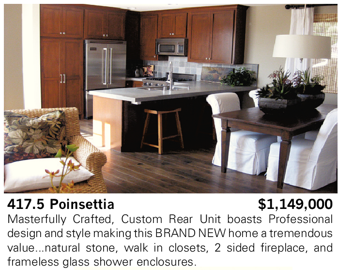 417.5 Poinsettia $1,149,000 Masterfully Crafted, Custom Rear Unit boasts Professional design and style making this BRAND NEW home a tremendous value...natural stone, walk in closets, 2 sided fireplace, and frameless glass shower enclosures.