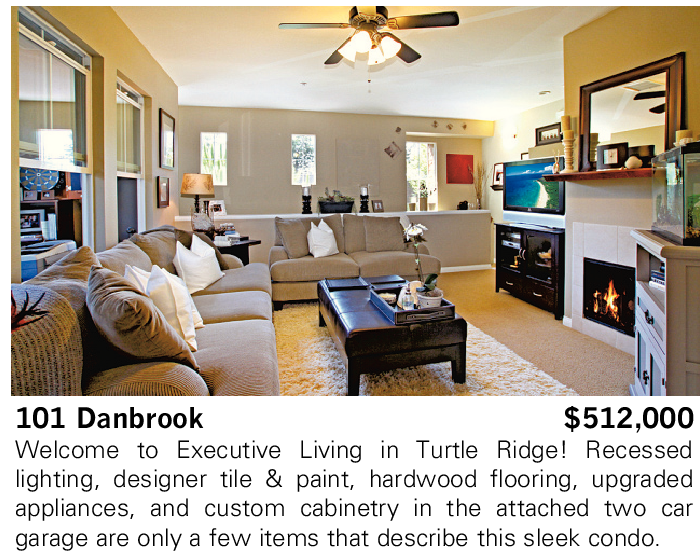 101 Danbrook $512,000 Welcome to Executive Living in Turtle Ridge! Recessed lighting, designer tile & paint, hardwood flooring, upgraded appliances, and custom cabinetry in the attached two car garage are only a few items that describe this sleek condo.