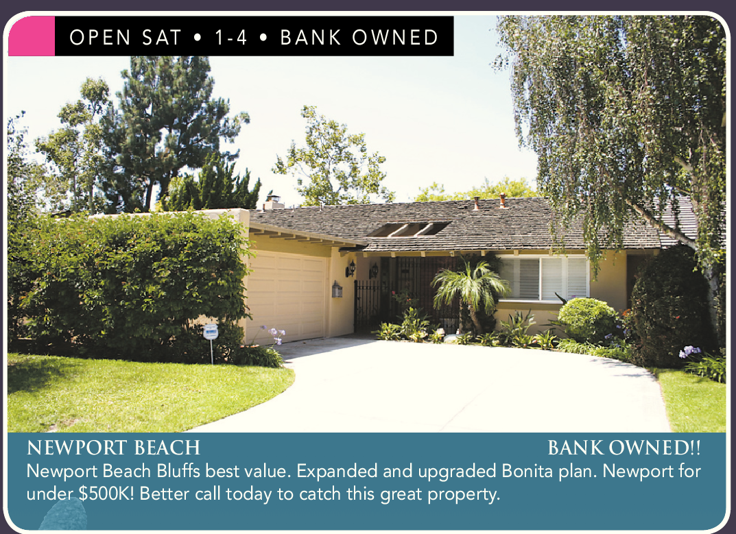 NEWPORT BEACH BANK OWNED!! Newport Beach Bluffs best value. Expanded and upgraded Bonita plan. Newport for under $500K! Better call today to catch this great property.
