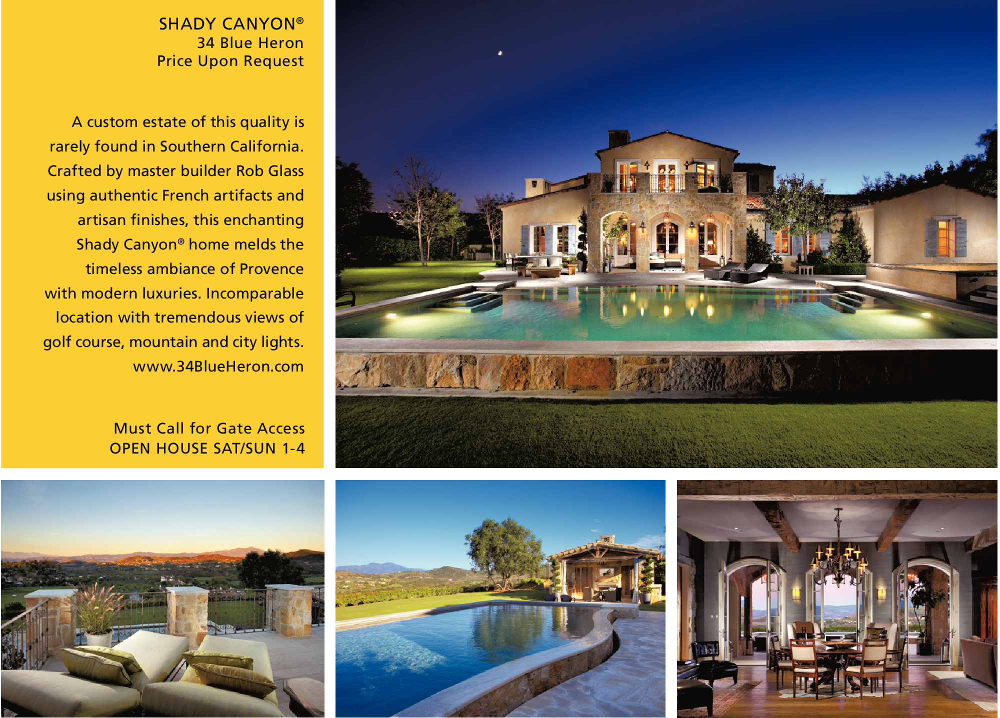 SHADY CANYON ® 34 Blue Heron Price Upon Request A custom estate of this quality is rarely found in Southern California. Crafted by master builder Rob Glass using authentic French artifacts and artisan finishes, this enchanting Shady Canyon ® home melds the timeless ambiance of Provence with modern luxuries. Incomparable location with tremendous views of golf course, mountain and city lights. www.34BlueHeron.com Must Call for Gate Access OPEN HOUSE SAT/SUN 1-4