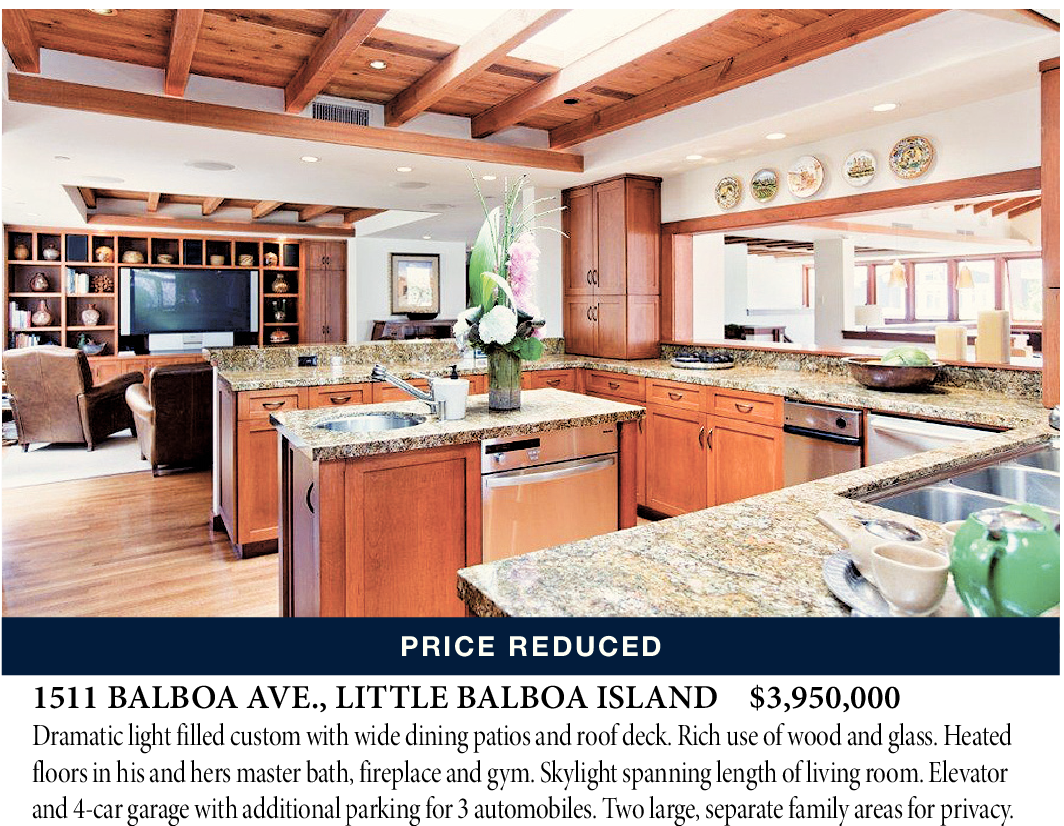 PRICE REDUCED 1511 BALBOA AVE., LITTLE BALBOA ISLAND $3,950,000 Dramatic light filled custom with wide dining patios and roof deck. Rich use of wood and glass. Heated floors in his and hers master bath, fireplace and gym. Skylight spanning length of living room. Elevator and 4-car garage with additional parking for 3 automobiles. Two large, separate family areas for privacy.