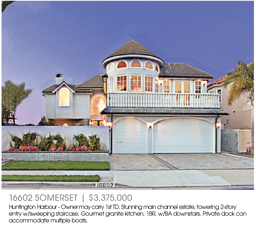16602 SOMERSET | $3,375,000 Huntington Harbour - Owner may carry 1st TD. Stunning main channel estate, towering 2-story entry w/sweeping staircase. Gourmet granite kitchen, 1BR, w/BA downstairs. Private dock can accommodate multiple boats.