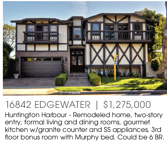 16842 EDGEWATER | $1,275,000 Huntington Harbour - Remodeled home, two-story entry, formal living and dining rooms, gourmet kitchen w/granite counter and SS appliances, 3rd floor bonus room with Murphy bed. Could be 6 BR.