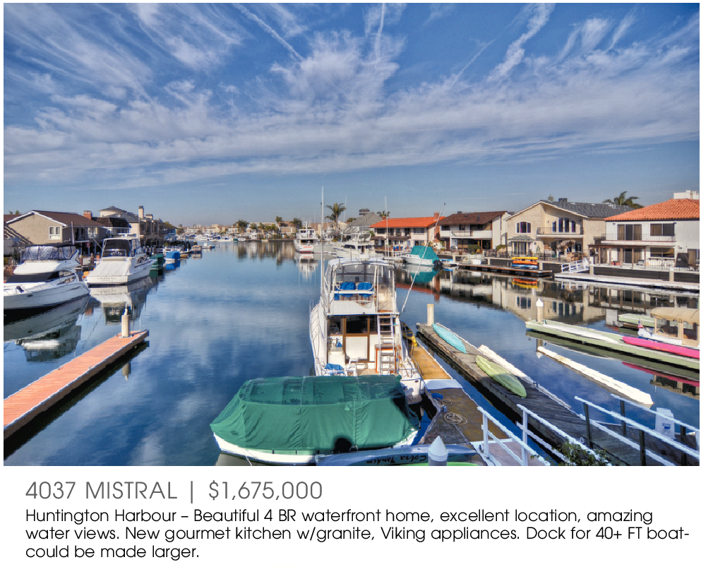 4037 MISTRAL | $1,675,000 Huntington Harbour – Beautiful 4 BR waterfront home, excellent location, amazing water views. New gourmet kitchen w/granite, Viking appliances. Dock for 40+ FT boatcould be made larger.