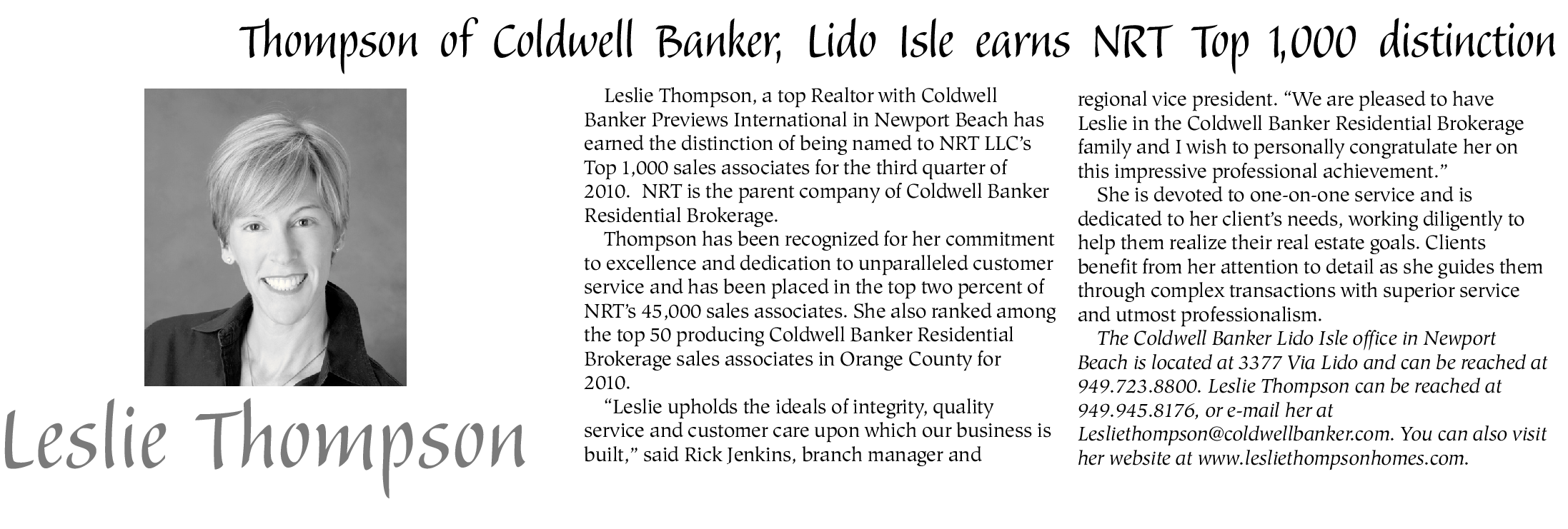 Thompson of Coldwell Banker, Lido Isle earns NRT Top 1,000 distinction Leslie Thompson Leslie Thompson, a top Realtor with Coldwell Banker Previews International in Newport Beach has earned the distinction of being named to NRT LLC’s Top 1,000 sales associates for the third quarter of 2010. NRT is the parent company of Coldwell Banker Residential Brokerage. Thompson has been recognized for her commitment to excellence and dedication to unparalleled customer service and has been placed in the top two percent of NRT’s 45,000 sales associates. She also ranked among the top 50 producing Coldwell Banker Residential Brokerage sales associates in Orange County for 2010. “Leslie upholds the ideals of integrity, quality service and customer care upon which our business is built,” said Rick Jenkins, branch manager and regional vice president. “We are pleased to have Leslie in the Coldwell Banker Residential Brokerage family and I wish to personally congratulate her on this impressive professional achievement.” She is devoted to one-on-one service and is dedicated to her client’s needs, working diligently to help them realize their real estate goals. Clients benefit from her attention to detail as she guides them through complex transactions with superior service and utmost professionalism. The Coldwell Banker Lido Isle office in Newport Beach is located at 3377 Via Lido and can be reached at 949.723.8800. Leslie Thompson can be reached at 949.945.8176, or e-mail her at Lesliethompson@coldwellbanker.com. You can also visit her website at www.lesliethompsonhomes.com.