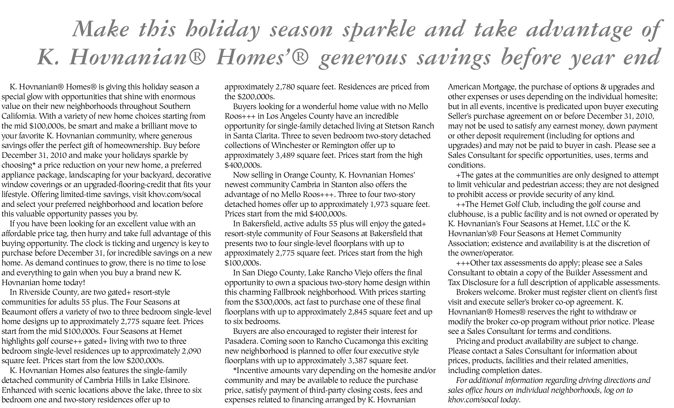 K. Hovnanian® Homes® is giving this holiday season a special glow with opportunities that shine with enormous value on their new neighborhoods throughout Southern California. With a variety of new home choices starting from the mid $100,000s, be smart and make a brilliant move to your favorite K. Hovnanian community, where generous savings offer the perfect gift of homeownership. Buy before December 31, 2010 and make your holidays sparkle by choosing* a price reduction on your new home, a preferred appliance package, landscaping for your backyard, decorative window coverings or an upgraded-flooring-credit that fits your lifestyle. Offering limited-time savings, visit khov.com/socal and select your preferred neighborhood and location before this valuable opportunity passes you by.