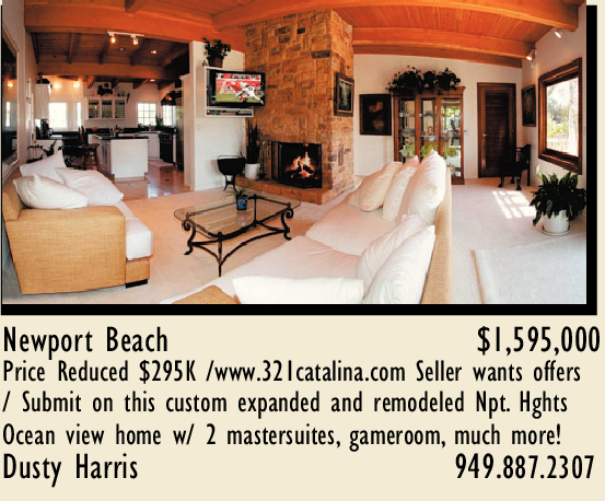 Newport Beach $1,595,000 Price Reduced $295K /www.321catalina.com Seller wants offers / Submit on this custom expanded and remodeled Npt. Hghts Ocean view home w/ 2 mastersuites, gameroom, much more! Dusty Harris 949.887.2307