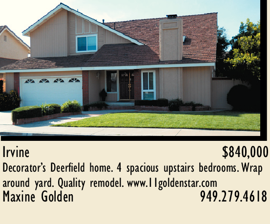 Irvine $840,000 Decorator’s Deerfield home. 4 spacious upstairs bedrooms. Wrap around yard. Quality remodel. www.11goldenstar.com Maxine Golden 949.279.4618