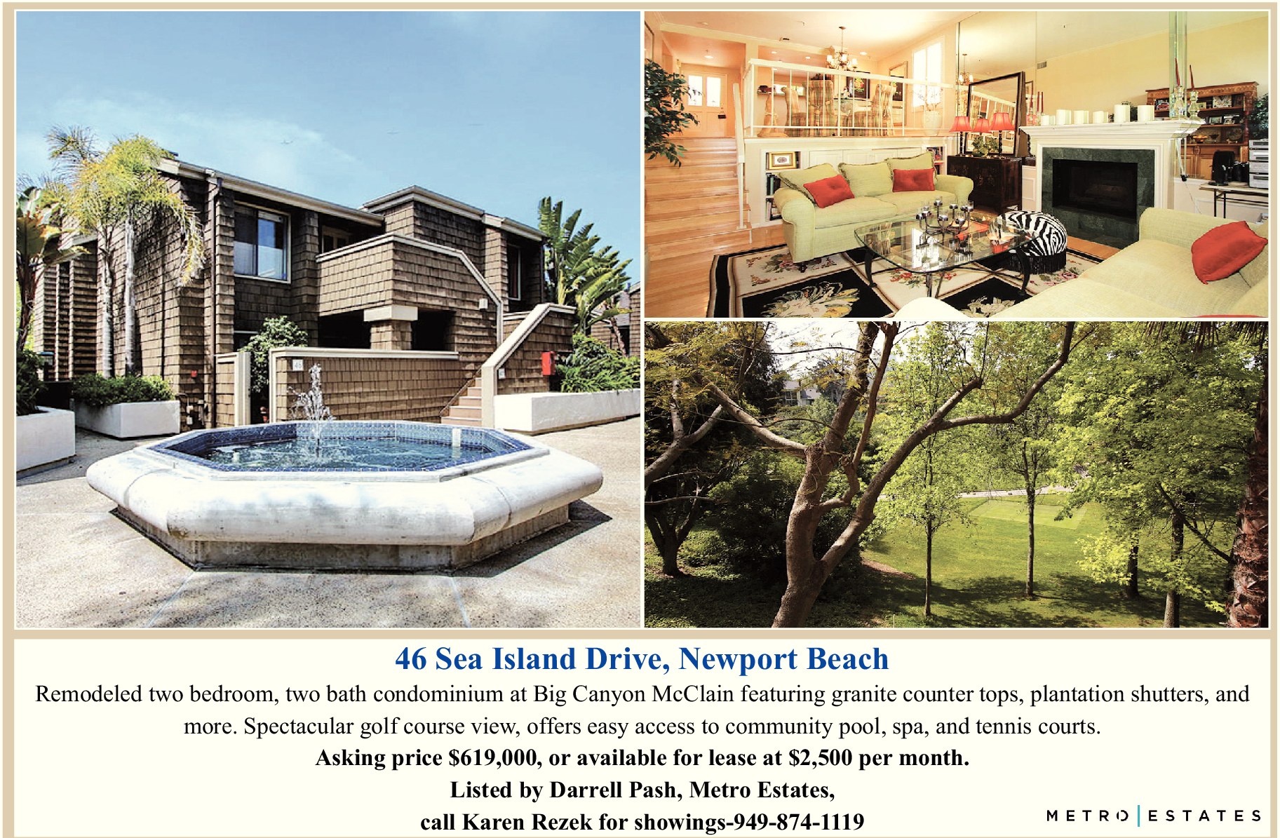 Listed by Darrell Pash, Metro Estates, call Karen Rezek for showings-949-874-1119