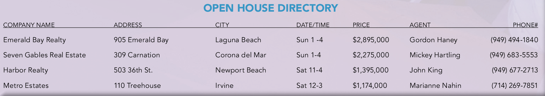 Emerald Bay Realty 905 Emerald Bay Laguna Beach Sun 1 -4 $2,895,000 Gordon Haney (949) 494-1840