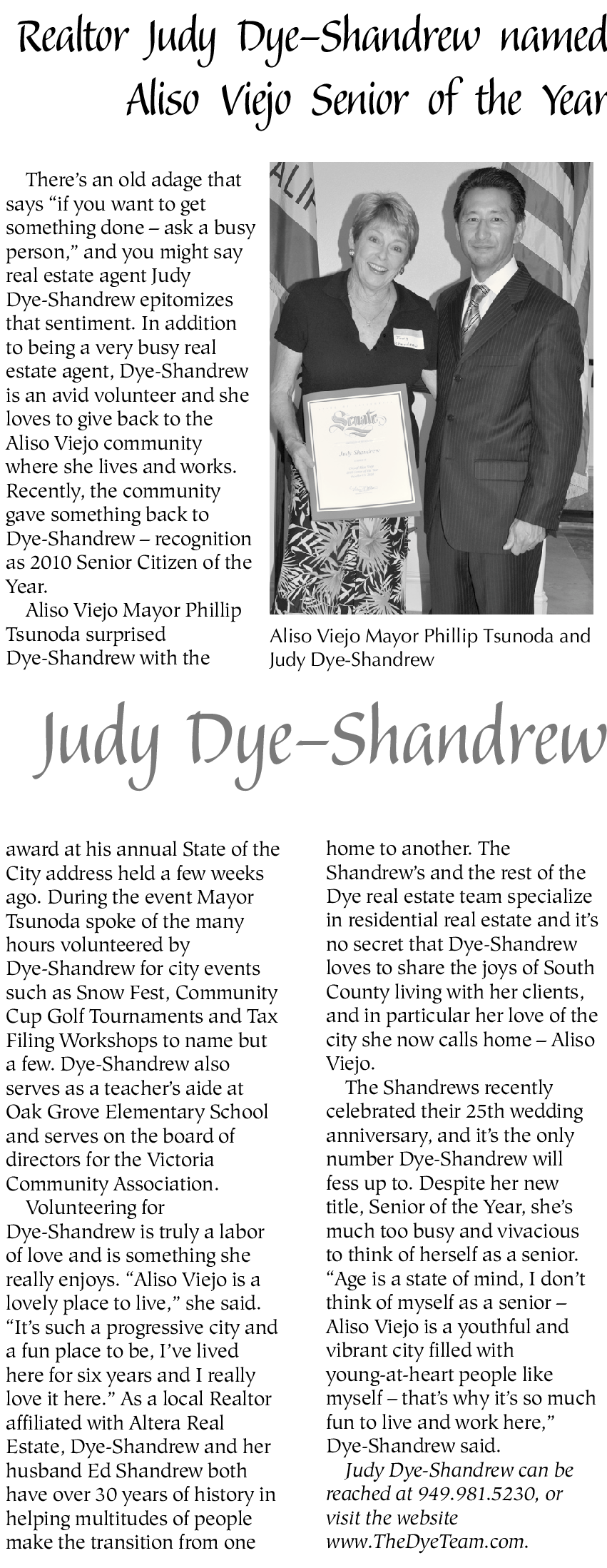 There’s an old adage that says “if you want to get something done – ask a busy person,” and you might say real estate agent Judy Dye-Shandrew epitomizes that sentiment. In addition to being a very busy real estate agent, Dye-Shandrew is an avid volunteer and she loves to give back to the Aliso Viejo community where she lives and works. Recently, the community gave something back to Dye-Shandrew – recognition as 2010 Senior Citizen of the Year.
