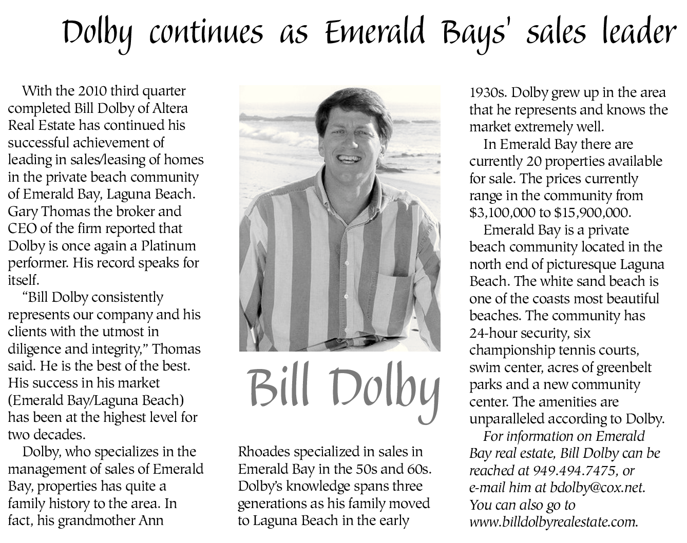 With the 2010 third quarter completed Bill Dolby of Altera Real Estate has continued his successful achievement of leading in sales/leasing of homes in the private beach community of Emerald Bay, Laguna Beach. Gary Thomas the broker and CEO of the firm reported that Dolby is once again a Platinum performer. His record speaks for itself.